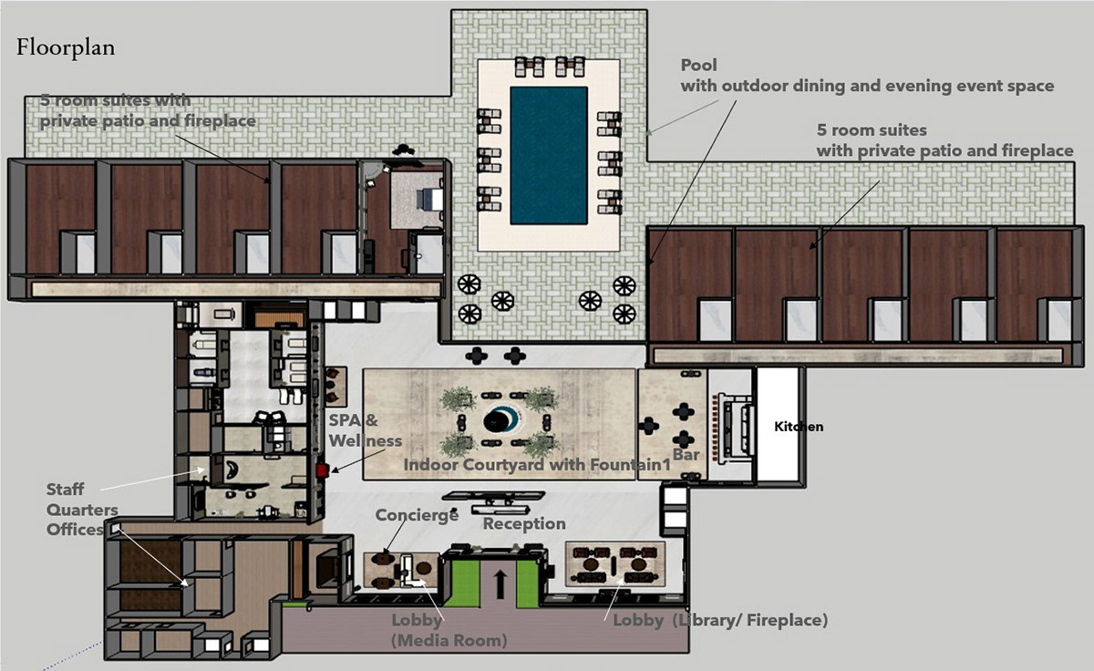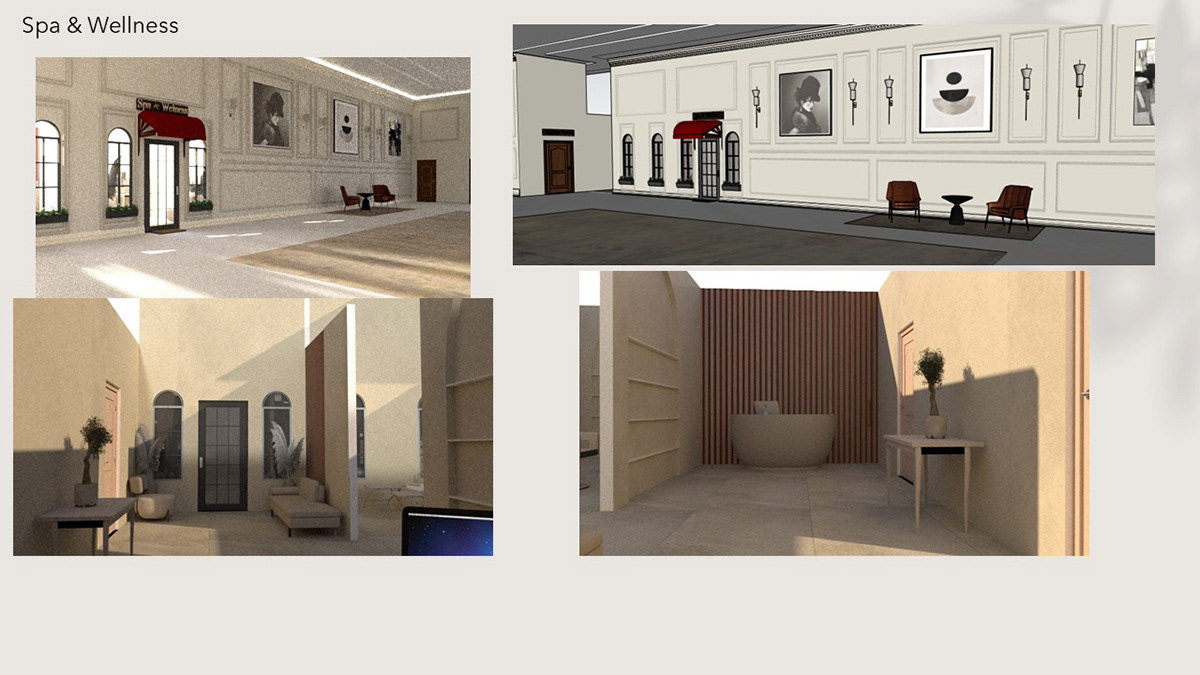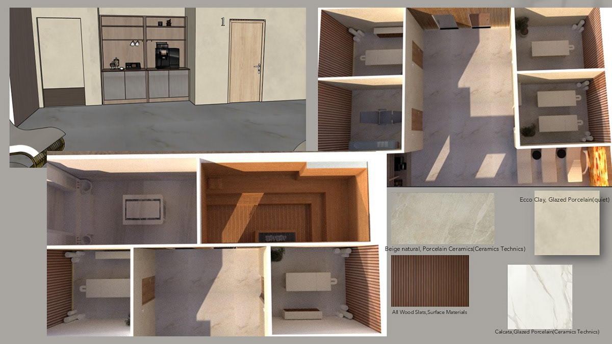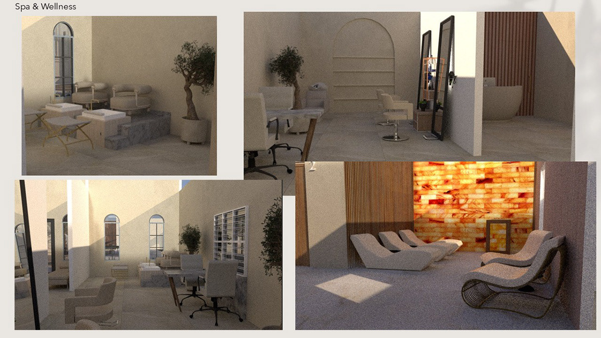 The entrance host/ waiting area branches out into wellness spa part through lockers, and full Salon.
